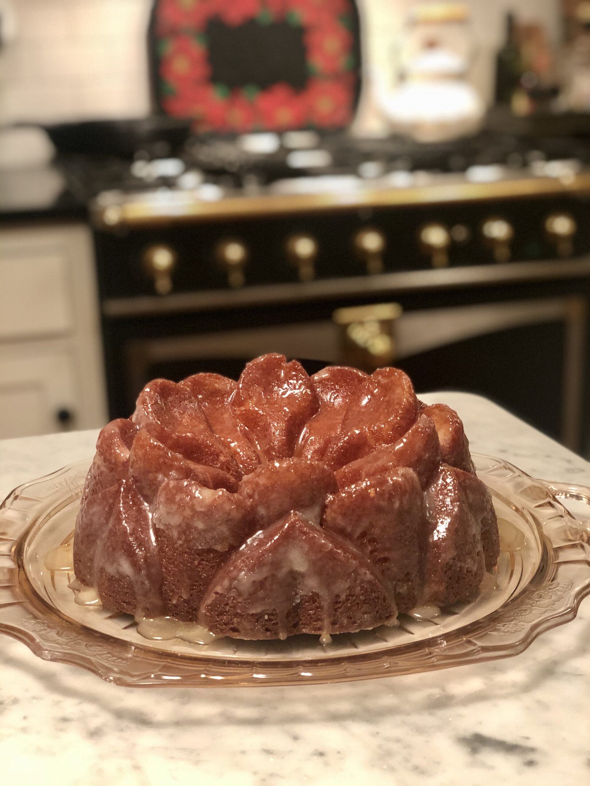 * I remove the cake from the pan once it has cooled, pour some glaze into the cake pan and then put the cake back in the pan and pour the remaining glaze all over it–including the sides.